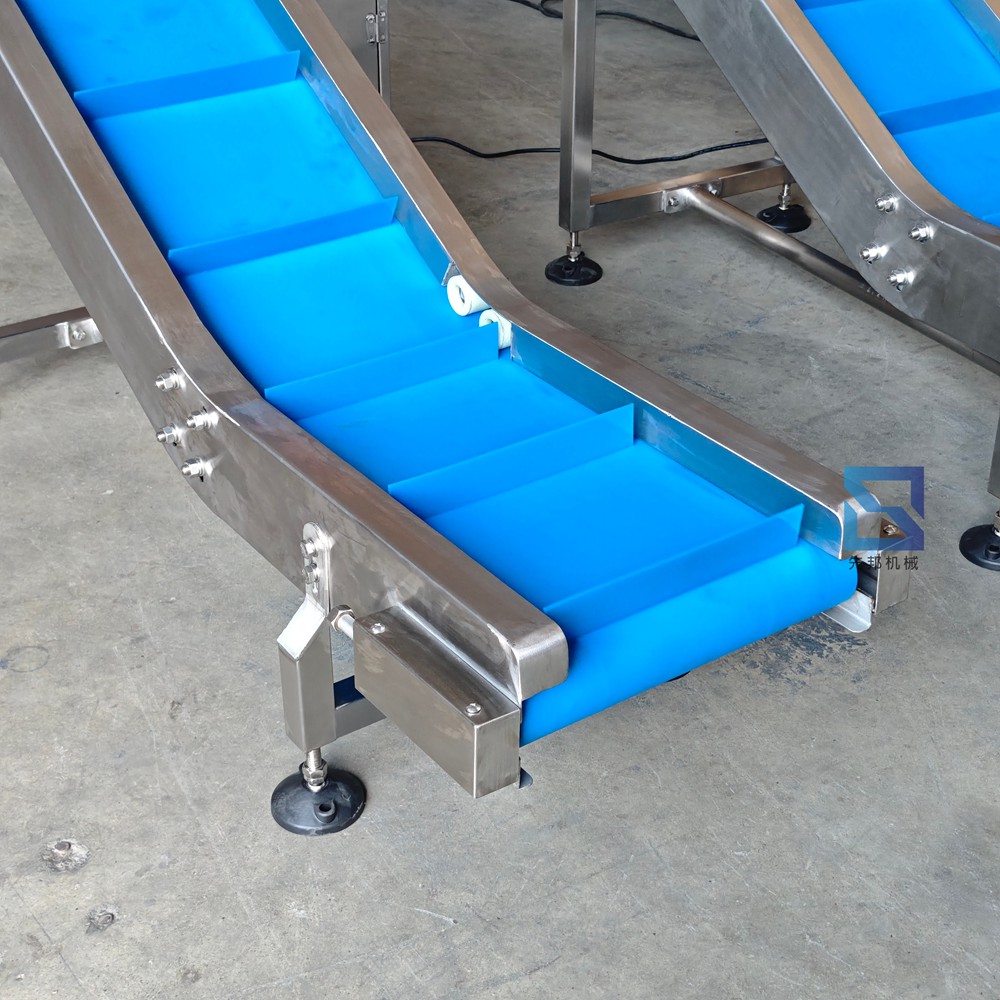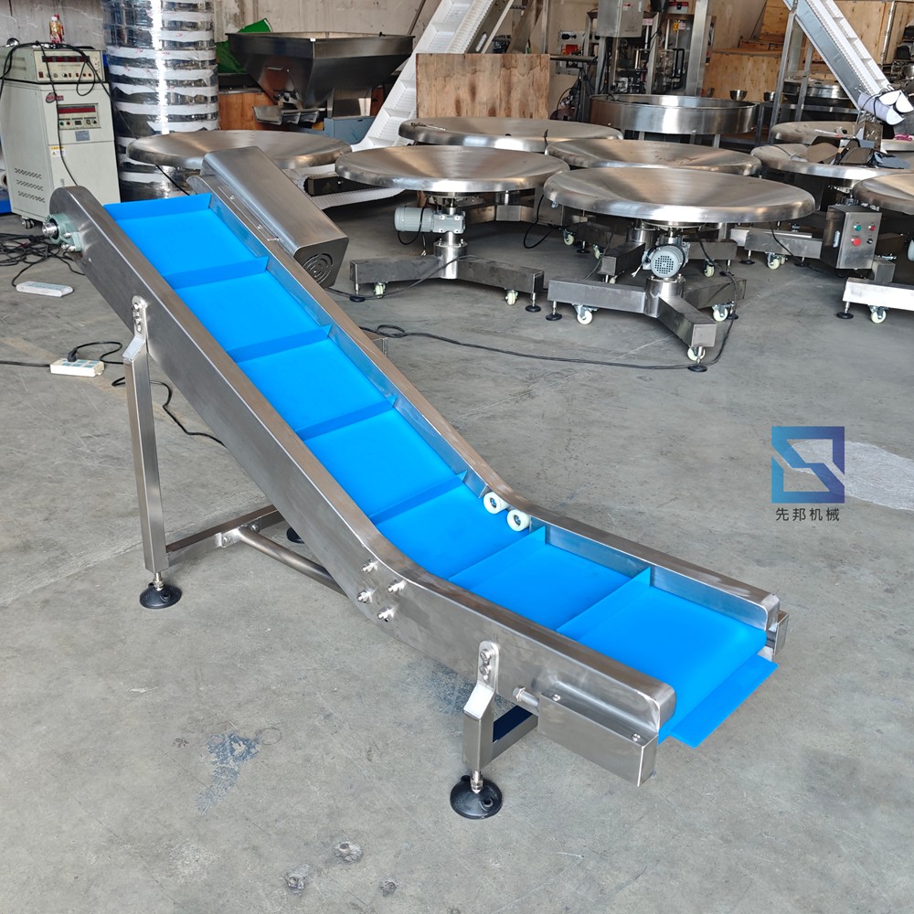 成品输送机:整体旋转送料输送,主要用于输送包装机或多头组合秤出来包装好或需要包装的物品。如小袋装物品,化工用品。比如面粉、或各种粉状物品、油炸物料或外表面带粉状物料等,将物料从低处倾斜输送到所需位置。